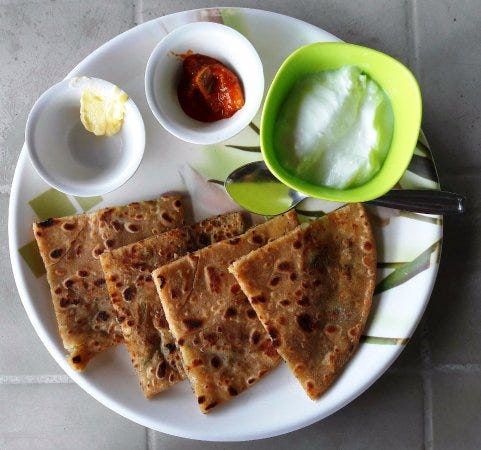 When I lived in Delhi with a Nepali house man, he took one look at my Kiwi proportions and decided to feed me like he would a Punjabi matron. So paratha for breakfast was the order of most office days and even though I grew tired of them, it’s just not in my DNA to refuse a good paratha.